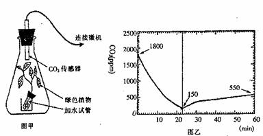 30,1, 将一株绿色植物放入一个三角瓶中,如下图甲所示。在瓶中安放一个测定瓶中二氧化碳浓度的传感器,将瓶口用橡胶塞塞上。传感器的另一端与计算机连接,以监测一段时间内瓶中二氧化碳浓度的变化。