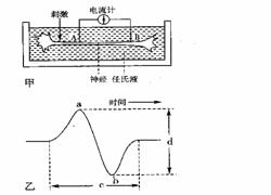 2, 取出未受操作影响的动物神经,泡在任氏液中,图中甲是与灵敏电流计连接的电极和神经在A、B两点接触的装置,刺激神经的一部分而使兴奋发生传递时,把电流计的指针的振动记录在图乙中。