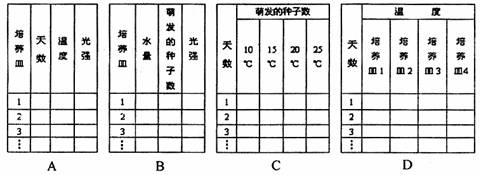 5.某研究性学习小组设计实验,检测温度对种子萌发速度的影响。他们在四个培养皿中放置湿滤纸,然后在每个培养皿中放了10粒小麦种子。将四个培养皿标号并放置于不同温度的黑暗环境中,培养皿1:10℃;培养皿2:15℃;培养皿3:20℃;培养皿4:25℃。每天记录各培养皿中种子萌发总数,持续进行2周。如果你是该小组的一员,你认为最适合记录实验结果的表格是 ( )