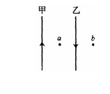 如图所示,同一平面内有两根固定的相互平行的长直导线甲和乙,现通有大小相等方向相反的电流。a、b两点与两导线共面。其中a点与两导线间距离均为r,b点在导线乙的右侧,与乙距离也为r。测得a点磁感应强度的大小为B,则去掉导线甲后,b点的磁感应强度方向和大小为 ( )