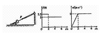 (14分)固定光滑细杆与地面成一定倾角,在杆上套有一个光滑小环,小环在沿杆方向的推力F作用下向上运动,推力F与小环速度v随时间变化规律如下图所示,取重力加速度g=10m/s2.