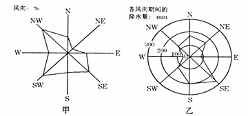 下图中甲为某城市的风向玫瑰图(全年各月平均风向频率),乙为雨量与风向关系图(某风向期间的降雨量),读图回答第69-70题。