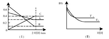 T℃时,在2L的密闭容器中,A气体与B气体发生可逆反应生成C气体,反应过程中A、B和C物质的量变化与时间关系如下图(Ⅰ)所示。若保持其它条件不变,温度分别为T1和T2时,B的物质的量分数与时间关系如下图(Ⅱ)所示。下列叙述正确的是