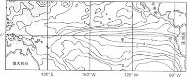 据报道,2006年形成了新的一轮厄尔尼诺现象。右图为“厄尔诺发生时太平洋表层水温异常现象示意图。”读图回答3-4题。