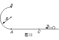 (12分)如图11所示,半径R=0.40m的光滑半圆环轨道处于竖直平面内,半圆环与粗糙的水平地面相切于圆环的端点A。一质量m=0.10kg的小球,以初速度v0=7.0m/s在水平地面上向左作加速度a=3.0m/s2的匀减速直线运动,运动4.0m后,冲上竖直半圆环,最后小球落在C点。求A、C间的距离(取重力加速度g=10m/s2)。