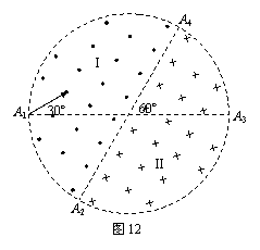 25、如图12所示,在一个圆形区域内,两个方向相反且都垂直于纸面的匀强磁场分布在以直径A2A4为边界的两个半圆形区域Ⅰ、Ⅱ中,A2A4与A1A3的夹角为60º。一质量为m、带电量为+q的粒子以某一速度从Ⅰ区的边缘点A1处沿与A1A3成30º角的方向射入磁场,随后该粒子