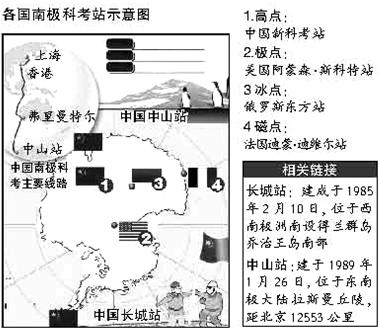 从科学考察价值和极地话语权角度来看,南极一共有四个必争之点:“极点”、“冰点”、“磁点”和“高点”,其中三个点已经被美国、法国、俄罗斯抢占。我国将在最后一个点--高点上建立我国的第三个科学考察站,预计2009年完成,2010年前争取全部建成。根据图文资料回答3-4题。