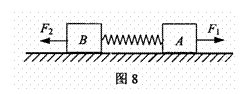 (18分)如图(8)所示,在水平地面上有A、B两个小物体,质量分别为mA=3.00kg、mB=2.00kg,它们与地面间的动摩擦因数均为μ=0.1. A、B之间有一原长为L=15.0cm、劲度系数为k=500N/m的轻质弹簧连接。分别用两个方向相反的水平恒力F1、F2同时作用在A、B两物体上. 当运动达到稳定时,A、B两物体以共同加速度大小为a=1.00m.s2作匀加速运动. 已知F1=20.0N,g取10m/s2.