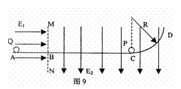 (22分)整个装置图如图(9)所示,在光滑绝缘水平面上固定一坚直的表面光滑的档板,ABCD为档板与水平面的交线,其中ABC为直线,CD为半径R=4.0cm的圆弧,C点为AC直线与CD圆弧的切点。整个装置置于真空中两有界的与水平面平行的匀强电场中,MN为两电场的分界面与水平面的交线,且MN垂直AB,在MN的左侧有一沿AB方向均强大小为E1=5.0×105V/m的匀强电场,在MN的右侧有一沿MN方向均强大小为E2=1.0×107V/M匀强电场。质量m2=4.0×10-2kg的不带电金属小球静置于C点,电量为q=+2.0×10-6C、质量为m1=4.0×10-2kg的小球Q自A点静止释放(P、Q两金属球的大小完全相同)。已知AB=0.5m,BC=1.20m,cos10°=0.985,