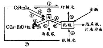 (6)长跑后肌肉酸痛,血液PH 有所下降,这是因为发生了图中的 (填序号)过程;之后酸痛消失,血液PH逐渐恢复,这主要是因为发生了图中的 (填序号)过程,此外还与血液中存在酸碱缓冲物质有关。