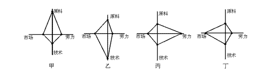 74.下图是工业区位选择模式图,其中线段长短表示影响程度 大小。下列情况与甲、乙、丙、丁四图相符的是: