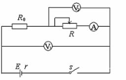 该同学想在完成学生实验“测电源电动势和内阻”的同时测出定值电阻R0的阻值,设计了如图所示的电路。实验时他用U1、U2、I分别表示电表V1、V2、A的读数。在将滑动变阻器的滑片移动到不同位置时,记录了U1、U2、I的一系列值. 其后他在两张坐标纸上各作了一个图线来处理实验数据,并计算了电源电动势、内阻以及定值电阻R0的阻值。