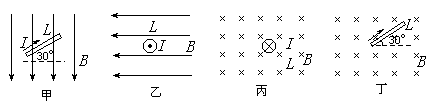 16、如图所示四种情况中,匀强磁场磁感应强度相同,载流导体长度相同,通过的电流也相同,导体受到的磁场力最大,且方向沿着纸面的情况是
