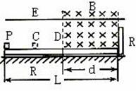 25.(20分)如图所示,PR是一长为L=0.64m的绝缘平板固定在水平地面上,挡板R固定在平板的右端,整个空间有一个平行于PR的匀强电场E,在板的右半部分有一个垂于纸面向里的匀强磁场B,磁场的宽度d=0.32m,一个质量m=0.50×10-3kg、带电荷量为