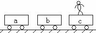 如图所示,三辆完全相同的平板小车a、b、c成一直线排列,静止在光滑水平面上。c车上有一小孩跳到b车上,接着又立即从b车跳到a车上。小孩跳离c车和b车时对地水平速度相同。他跳到a车上没有走动便相对a车保持静止,设a,b两车不相撞,此后