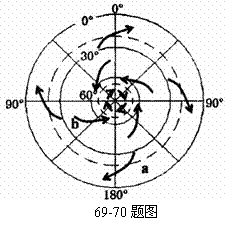 读某节气半球近地面风带分布模式图,回答69-70题。