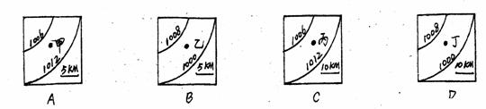 73、甲、乙、丙、丁四地中,风力最大的是: