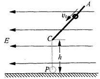 (15分)如图所示,在水平方向的匀强电场中有一表面光滑、与水平面成45°角的绝缘直杆AC,其下端(C端)距地面高度h=0.8m。有一质量500g的带电小环套在直杆上,正以某一速度,沿杆匀速下滑,小环离杆后正好通过C端的正下方P点处。(g取l0m/s2)求: