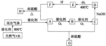 29.(14分)“C1化学”是指以分子中只含一个碳原子的物质为原料进行物质合成的化学。下图是以天然气的主要成分为原料的合成路线流程图,其中“混合气体”的成分与水煤气相同;B的水溶液有杀菌防腐性能;D是C的钠盐,2mol D分子间脱去1mol H2分子可缩合生成E;H是F与A按物质的量之比为1∶2反应的产物。