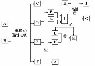 A、B、C、D、E、F、G、H、I、J、K、L、M等为中学化学常见的物质,其中C、D为非金属单质,F、G、H为金属单质,A的稀溶液呈蓝色,常温下B为无色、无味的液体,K是一种污染大气的气体。物质之间的转化关系如下图所示,部分反应物、产物及反应条件未标出。