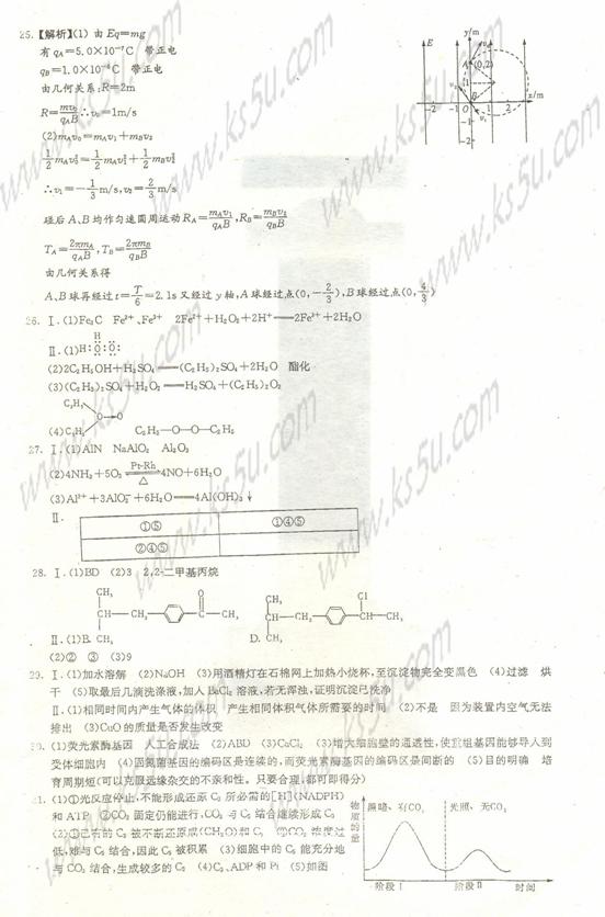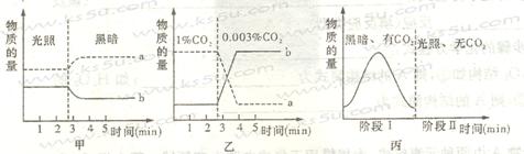 (21分)下图中甲、乙是改变光照和CO2浓度后,与光合作用有关的C3化合物和C5化合物在细胞内的变化曲线,丙图是实验前在溶液中加入了破损外膜和内膜的叶绿体及一定量的ATP和NADPH,然后分连续的Ⅰ、Ⅱ两个阶段进行的实验,请回答有关问题: