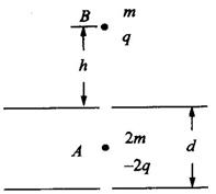 (19分)如图所示,一平行板电容器水平放置,板内有竖直方向的匀强电场,板间距为d=0.4m,两块板上分别有一个小孔在同一竖直方向上,有一个带负电金属小球A质量为2m,电量为-2q,静止于两小孔正中间.另有一带正电与A球大小相同的小球B,质量为m,电量为q,由上板小孔的正上方h=d=0.4m处,静止释放,不计阻力及小球间的静电力,小球下落进入电场后与A球发生正碰,碰撞时间极短,碰后A、B电量相同,A球速度为2.5m/s,求: