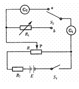 ①实验中该同学先按正确的操作步骤连接电路,接着合上开关S1,再将开关S2与a相连,调节滑动变阻器R的滑片P,当电流表G2有某一合理的示数时,记下电流表G1的示数为I;然后将开关S2与b相连,保持 不变,调节 ,使电流表G1的示数仍为I时,读取电阻箱的阻值为r。