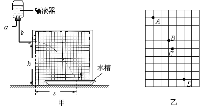 将针头与医用输液器等器材按图甲所示连接好实验装置(其中针头固定在一次性输液管的末端O点,并保持水平状态),打开输液管的开关让水以恒定的速度喷出(下方用水槽装喷出的水),然后用不干胶贴在画有方格的透明玻璃板背面,记下水流运动轨迹上的A、B、C、D四点(如图乙所示)。若每小格边长均为