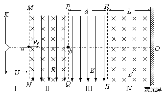 25.(20分)如图所示的MN、PQ、RH分别为Ⅰ、Ⅱ、Ⅲ、Ⅳ四个区域的分界面,阴极K与MN界面之间的区域Ⅰ为一加速电场,界面MN与PQ之间Ⅱ区域存在相互正交的匀强电场和匀强磁场,界面PQ与RH之间的Ⅲ区域存在一向下的匀强电场,界面RH与荧光屏之间的Ⅳ区域存在匀强磁场,且MN、PQ、RH与荧光屏相互平行,电场和磁场的方向如图所示,区域Ⅱ、Ⅲ的电场强度均为E、区域Ⅱ、Ⅳ中的磁场磁感应强度均为B,区域Ⅲ中偏转电场的宽度为d。图中a点与O点的连线垂直于荧光屏,一带负电粒子由静止开始经区域Ⅰ的电场加速后从a点离开加速电场,速度方向垂直MN面进入区域Ⅱ后沿直线前进,穿过PQ界面上的b点后射入区域Ⅲ的偏转电场中,在离开偏转电场后又进入区域Ⅳ中的匀强磁场,最后恰好垂直地打在荧光屏上。已知电场与磁场区域在竖直方向足够长,区域Ⅰ加速电场电压与区域Ⅲ中偏转电场场强的关系为U=Ed/2,不计粒子重力。试求: