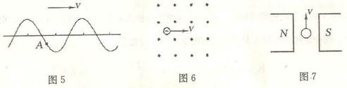 (2).(2分)如图6所示,一带负电粒子在垂直于纸面向外的匀强磁场中运动,某一时刻其速度v的方向向右,请用箭头标出该时刻粒子在磁场中所受洛伦兹力f的方向。