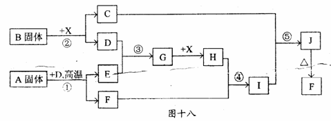 28 ( l5 分)根据下图十八所示关系填空,己知所有字母表示的是纯净物或水溶液,反应① 、③ 是工业生产中的重要反应,D 、E 常温下为气休,x 常温下为无色液体,H 与E 相对分子质量之间的关系为Mr(H)- Mr(E) = 34 ,又知C焰色反应火焰呈黄色.