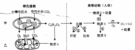 (4)发生在高等动物细胞结构乙中的生理过程是(填序号) ;在缺氧情况下,物质A 可通过⑤ 过程形成物质C(填名称) ,其去路主要为 ;物质A 在肝脏内可以在谷丙转氨酶的作用下进作用,形成物质B(填名称)
