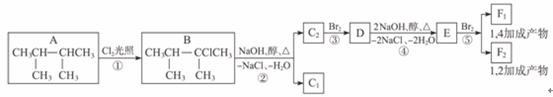 解析:本题的前两问比较简单,第(1)问考查有机物的命名,第(2)问考查有机反应的基本类型,第(3)、(4)问则是利用有关反应和性质来确定物质的结构,由B的结构及反应条件可知C1、C2可能为(CH3)2CHC(CH3)====CH2或(CH3)2C====C(CH3)2,由于E可发生1,4-加成和1,2-加成,则E为二烯烃,不难推得C2为(CH3)2C====C(CH3)2,D为