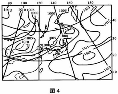 读某日某时海平面天气图(图4,单位:百帕),回答74-75题。