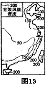 图13为我国沿海地区有效风能密度分布图,读图回答: