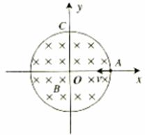 B、方向垂直于纸面向里的匀强磁场,如图所示. 一个不计重力的带电粒子从磁场边界与 x轴的交点 A处以速度 v沿-x方向射入磁场,它恰好从磁场边界与 y轴的交点C处沿+y方向飞出.
