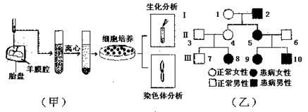 ⑵通过细胞生化分析,可以判断胎儿是否得先天性代谢缺陷病, 先天性代谢缺陷是指遗传性酶缺陷所导致的疾病,目前已发现各种先天性代谢缺陷100多种,其中80多种可以通过产前检查羊水中的酶而做出诊断。在一次羊水检查中发现一男性胎儿患有某种遗传病,调查知道其姐姐也患有此病,上面乙图是其家庭的部分遗传系谱图,分析回答下列问题: