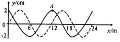一列简谐横波原来波形如图实线所示,经过时间t后变成图中虚线所示的波形。已知波向左传播,时间t小于1个周期,图中坐标为(12,2)的A点,经时间t后振动状态传播到B点,则( )