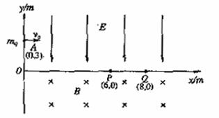 24.(18分)如图所示,在直角坐标系xoy的第一象限中分布着沿y轴负方向的匀强电场,在第四象限中分布着方向向里垂直纸面的匀强磁场. 一个质量为m、带电+q的微粒,在A点(0,3)以初速度v0=120m/s平行x轴射入电场区域,然后从电场进入磁场,又从磁场进入电场,并且先后只通过x轴上的p点(6,0)和Q点(8,0)各一次. 已知该微粒的比荷为