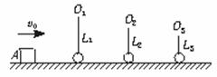 25. (20分)如图所示,滑块A的质量m=0.01 kg,与水平地面间的动摩擦因数μ=0.2,用细线悬挂的小球质量均为m=0.01 kg,沿x轴排列,A与第1只小球及相邻两小球间距离均为s=2 m,线长分别为L1、L2、L3…(图中只画出三只小球,且小球可视为质点),开始时,滑块以速度v0=10 m/s沿x轴正方向运动,设滑块与小球碰撞时不损失机械能,碰撞后小球均恰能在竖直平面内完成完整的圆周运动并再次与滑块正碰,g取10 m/s2,求: