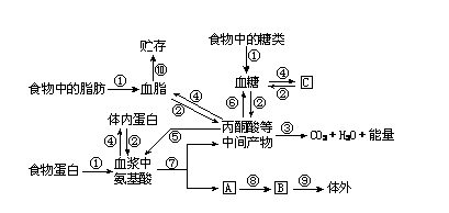 (4)人每天要吃一定量的蛋白质的原因是不能进行类似图中的 ,也不能完全进行图中的 ,而又每天要进行图中的 而消耗所致(只填标号)。