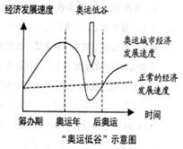 奥运会对于主办城市而言,机遇与风险并存。在筹办期,由于奥运场馆和其他基础建设投资的大幅增长,经济发展相当强劲;在奥运期间,随着人流大量涌入,消费需求旺盛,经济也因此生机勃勃。但是在后奥运阶段,主办城市经济却常常出现衰退,步入低谷(读右图)。形成“低谷”的主要原因在于