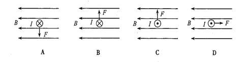 17. 通电直导线放在匀强磁场中,磁感应强度B的方向如图所示。“×”表示导线中电流I的方向垂直于纸面向里,“⊙”表示导线中电流I的方向垂直于纸面向外。图中标出了导线所受安培力F的方向,其中正确的是