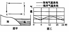 下面甲、乙两图分别表示北半球某滨海地区某日海陆上空大气运动和海陆气温变化情况。根据右图提供的信息,回答85-86题。
