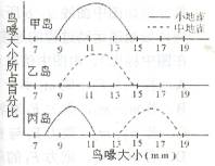 在甲、乙、丙三个岛上,小地雀与中地雀鸟喙大小的分布情形如图,在下列推论中,正确的是
