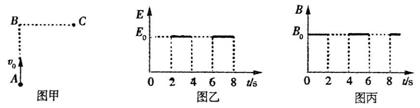 20. 如图甲所示,空间中存在一个变化的电场和一个变化的磁场,电场的方向水平向右(图甲中由B到C),电场强度的大小随时间变化情况如图乙所示;磁感应强度方向垂直于纸面,磁感应强度的大小随时间变化情况如图丙所示,在t=1 s时,从A点沿AB方向(垂直于BC)以初速度v0射出第一个粒子,并在此之后,每隔2 s有一个相同的粒子沿AB方向均以初速度v0射出,射出的粒子均能击中C点,若AB=BC=l,粒子由A运动到C的时间均小于1 s. 不计粒子重力、空气阻力及电磁场变化带来的影响. 则以下说法不正确的是( )