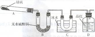 用如下装置来探究绿矾受热分解的产物情况(加热及夹持装置未画出)。实验过程中发现:装置A中出现红色固体,装置B中无水硫酸铜变蓝,装置C的U型管中有无色晶体出现,装置D中品红溶液褪色。