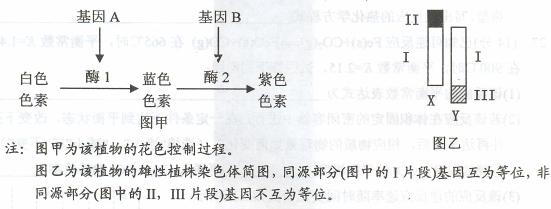 (1)图甲中的基因是通过控制 的合成来控制代谢过程,从而控制该植物的花色性状。