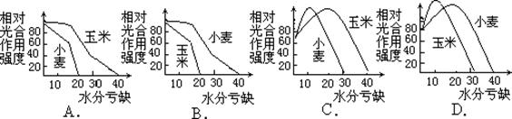 有人曾做过实验,把玉米和小麦的叶子从植株上切下后,立即分别放在保持高温度、光照充足的容器内(保持生活状态),叶子的含水量,由于蒸腾而徐徐减少,然后,测定叶子在发生水分亏缺(相对值)情况下,相对光合作用强度,正确的图示是