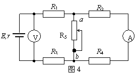 20.在如图4所示的电路中,R1、R2、R3和R4为定值电阻,R5为可变电阻,电源的电动势为E,内阻为r,设电流表A的读数为I,电压表V的读数为U,当R5的滑动触点向图中a端移动时,则